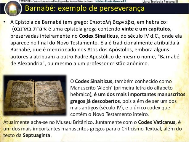 Vós, porém, direis: “O povo recebeu a circuncisão como selo.” Contudo, todos os sírios, os árabes e todos os sacerdotes dos ídolos também têm a circuncisão. Pertencem também eles à sua aliança? Até os egípcios praticam a circuncisão! Filhos do amor, aprendei mais particularmente estas coisas: Abraão, praticando por primeiro a circuncisão, circuncidava porque o Espírito dirigia profeticamente seu olhar para Jesus, dando-lhe o conhecimento das três letras. Com efeito, ele diz: “E Abraão circuncidou entre os homens de sua casa trezentos e dezoito homens.” Qual é, portanto, o conhecimento que lhe foi dado? Notai que ele menciona em primeiro lugar os dezoito e depois, fazendo distinção, os trezentos. Dezoito se escreve: I, que vale dez, e H, que representa oito. Tens aí: IH(sous) = Jesus. E como a cruz em forma de T devia trazer a graça, ele menciona também trezentos (= T). Portanto, ele designa claramente Jesus pelas duas primeiras letras e a cruz pela terceira. Quem depositou em nós o dom do seu ensinamento sabe bem disto: Ninguém recebeu de mim ensinamento mais digno de fé. Sei, porém, que vós sois dignos.